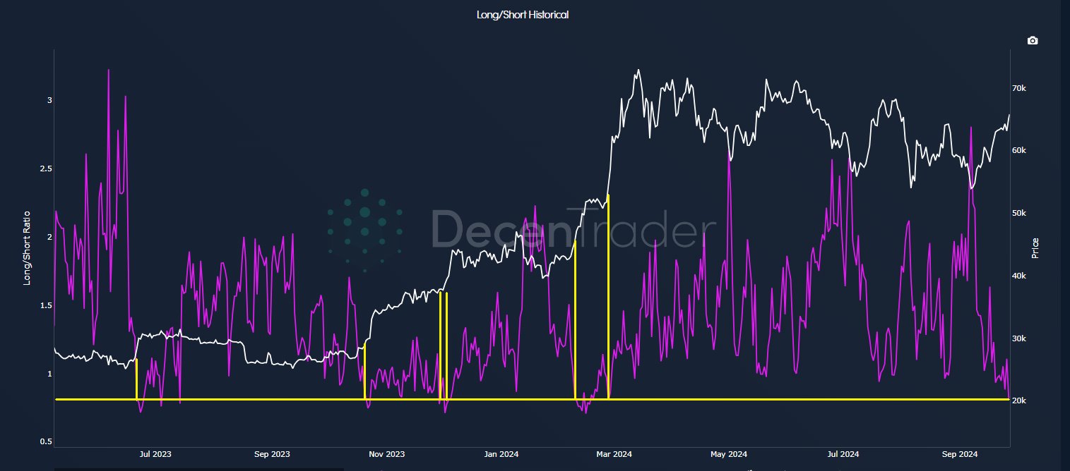 در یک نشانه بالقوه دیگر از اقدام صعودی قیمت در آینده، Filbfilb، یکی از بنیانگذاران مجموعه معاملاتی DecenTrader، از نسبت “بسیار پایین” موقعیت های خرید به فروش بیت کوین خبر داد.