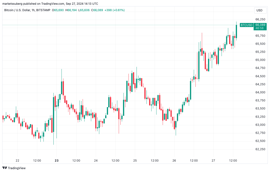 با رسیدن قیمت بیت کوین به مرز ۶۶ هزار دلار در روز ۲۷ سپتامبر، این بازار بار دیگر شاهد رونق قابل توجهی بود که بسیاری از ناظران بازار را هیجان زده کرد. این افزایش قیمت با رشد چشمگیر بازار سهام چین، که بهترین هفته خود را در ۱۶ سال اخیر تجربه کرد، همزمان شده است.